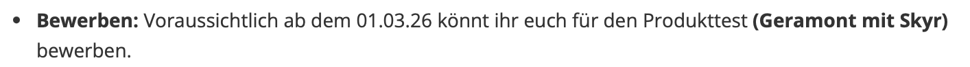 • Bewerben: Voraussichtlich ab dem 17.02.26 könnt ihr euch fĂŒr den Produkttest (Geramont mit Skyr) bewerben.