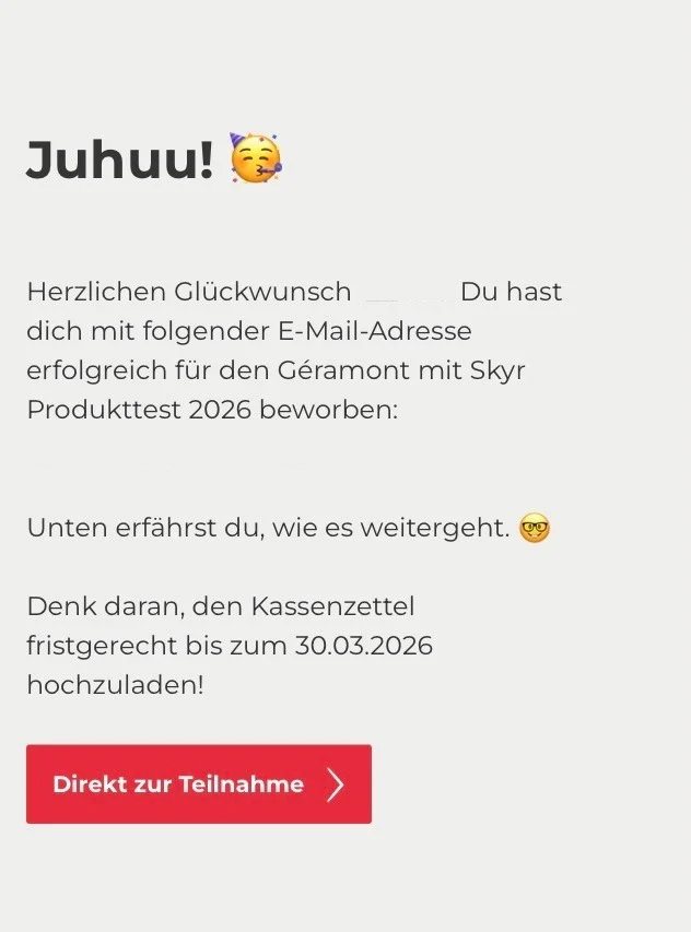 - Bewerben: Voraussichtlich ab dem 17.02.26 könnt ihr euch fĂŒr den Produkttest (Geramont mit Skyr) bewerben.