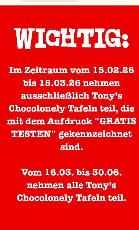 Im Zeitraum vom 15.02.26 bis 15.03.26 sind ausschlieĂlich Tony’s Chocolonely Tafeln teilnahmeberechtigt, die den Aufdruck ‚GRATIS TESTEN!‘ tragen.