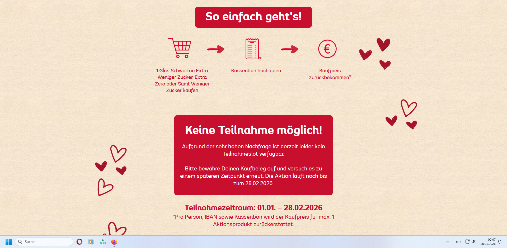 Die Schwartau gratis testen Aktion lĂ€uft bereits seit 01.01.2026 und dauert noch bis 28.02.2026. Beachtet aber bitte: Das Teilnahmekontingent ist hier auf 1000 Einlösungen tĂ€glich begrenzt.Â