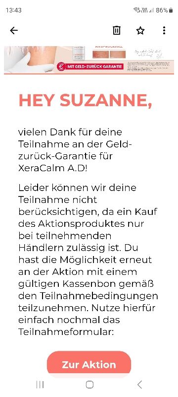 @MoniX87X: Die Teilnahmebedingungen umfassen sowohl stationäre Apotheken als auch Online-Apotheken. Der Kauf eines teilnehmenden XeraCalm A.D Produkts kann also sowohl in einer stationären als auch in einer Online-Apotheke erfolgen. Das kannst du zudem auch nochmal hier nachlesen: https://xera-calm-gzg.de/tnb