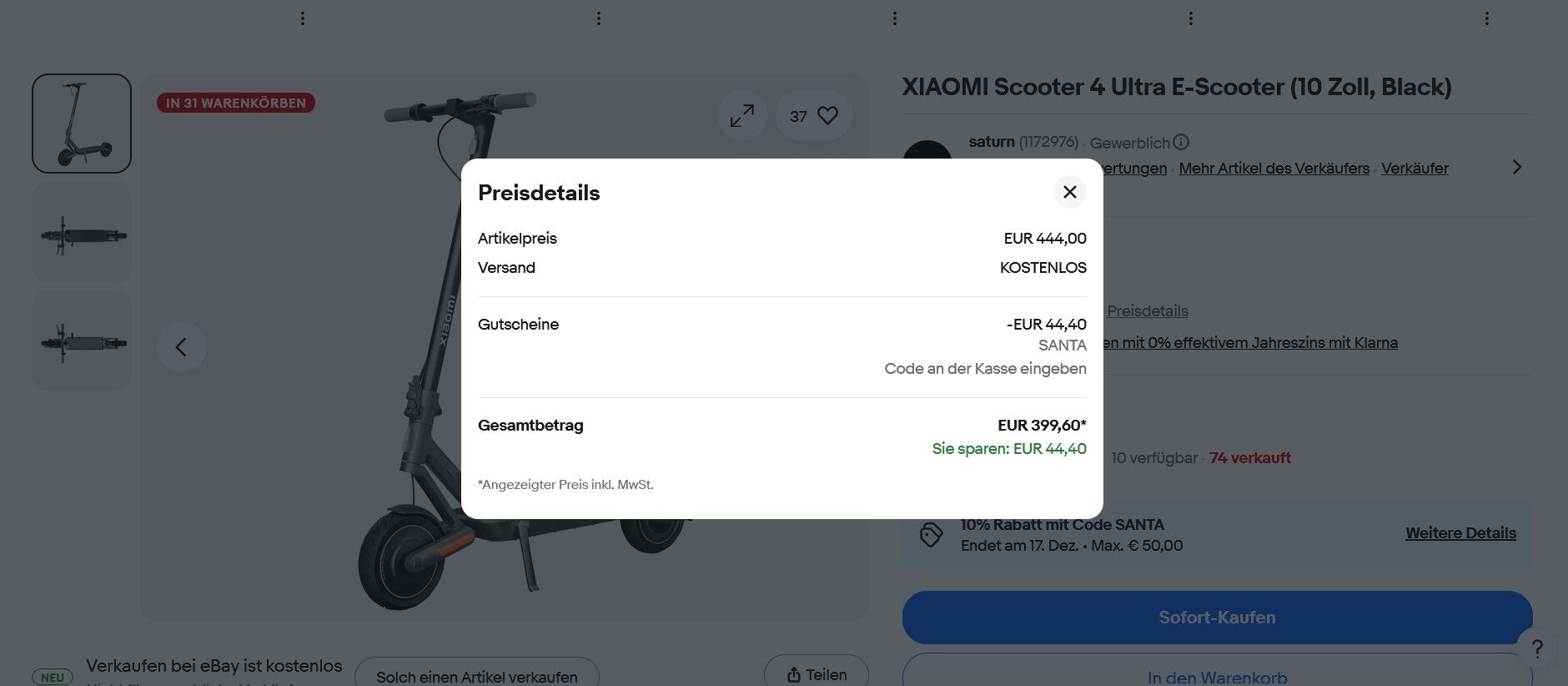 Bei eBay Saturn und eBay MediaMarkt bekommt man mit dem Gutscheincode Code wurde kopiert den XIAOMI E-Scooter 4 Ultra (StVZO-konform / bis zu 70 km Reichweite / Dual-Federungssystem) für nur 399,60€ inkl. Versand.