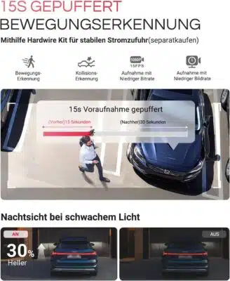 Für die Datenübertragung nutzt die Dashcam schnelles 5 GHz WLAN, wodurch ihr Videos zügig auf euer Smartphone laden könnt, ohne lange Wartezeiten in Kauf nehmen zu müssen. Ein Highlight für Sicherheitsbewusste ist der gepufferte Parkmodus: