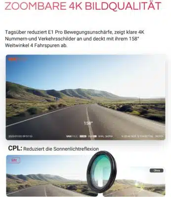 Gegenüber dem Standard-Modell E1 bietet die Pro-Version den entscheidenden Sprung von 2,5K auf 4K-Auflösung und den besseren Sensor. Im Vergleich zu Konkurrenten wie der 70mai T800, die einen ähnlichen Chip nutzt, punktet die Vantrue durch den bereits beiliegenden Polfilter.