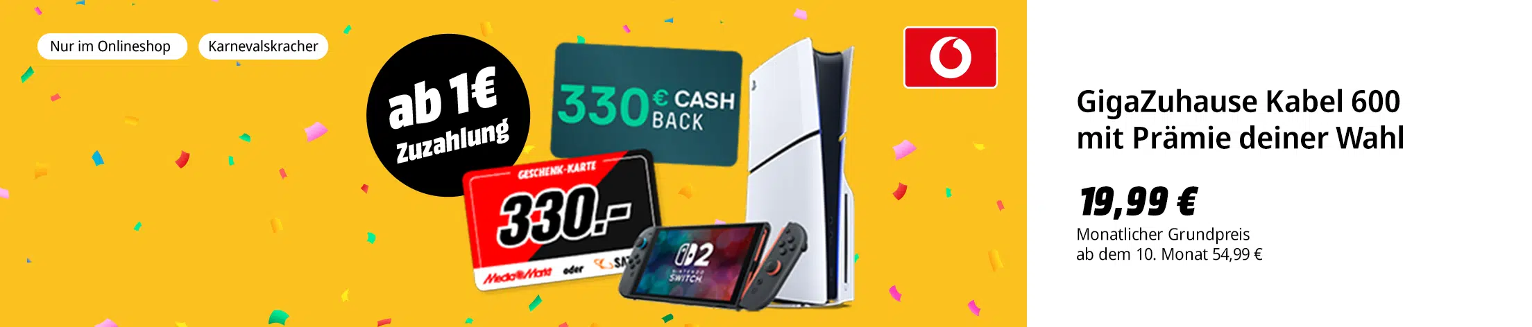 Ihr wollt Highspeed-Internet, habt aber keine Lust auf monatliche Mietgebühren für den Router oder teure Hardware-Anschaffungen? Dann hat MediaMarkt gerade genau das Richtige für euch. Bei den aktuellen Vodafone GigaZuhause Kabel-Deals bekommt ihr nicht nur ordentlich Dampf auf der Leitung, sondern staubt Prämien ab, die den Effektivpreis komplett in den Keller drücken. Ob PS5, iPad oder 330 € Cashback – hier ist für jeden Geschmack etwas dabei!