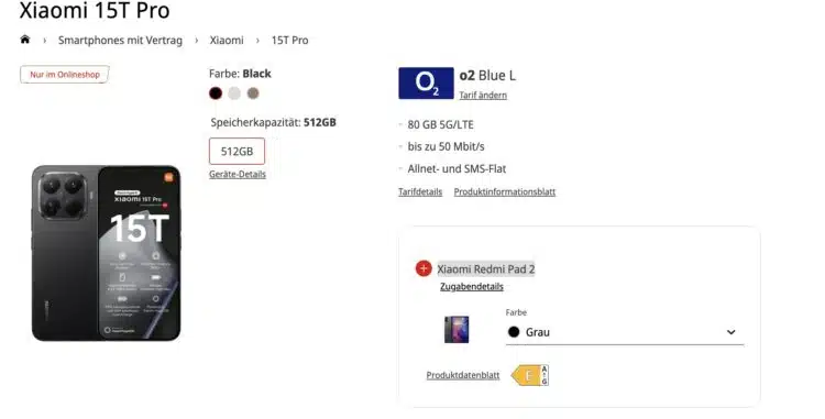đ± Neues Xiaomi 15T Pro (512GB) fĂŒr 1⏠+ GRATIS: Xiaomi Redmi Pad 2 (Wert: 130âŹ) + 80GB 5G/LTE Allnet fĂŒr 24,99âŹ/Monat (o2 Blue L)