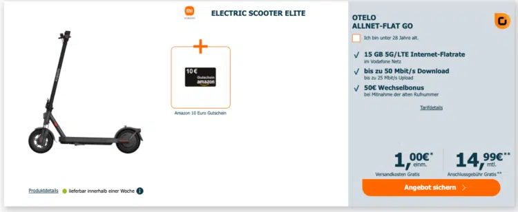 - Xiaomi Electric Scooter Elite für 1€ + otelo Allnet-Flat Go (15GB LTE/5G) für 14,99€/Monat
