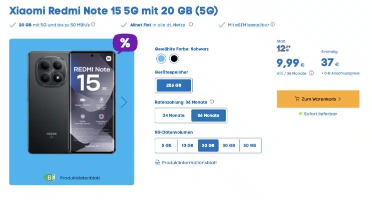 - Xiaomi Redmi Note 15 5G (256GB) für 37€ + 20GB Allnet Flat für 9,99€/Monat