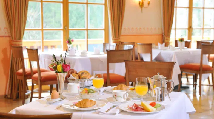 Am Morgen stärkt ihr euch am abwechslungsreichen Frühstücksbuffet mit frischen Backwaren, Obst, Eiergerichten und regionalen Produkten. Bei schönem Wetter genießt ihr die erste Mahlzeit des Tages sogar auf der Panoramaterrasse.